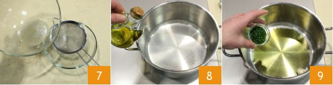 Das Kochwasser der Venusmuscheln, das Sie gesammelt haben, abseihen 7 und verwenden, um das Tomatenkonzentrat zu verdünnen. Nun die Fregola kochen, indem Sie in einem heißen Topf das Olivenöl 8 geben, 2 ganze oder zerdrückte Knoblauchzehen, wenn Sie es vorziehen, hinzufügen und einen Esslöffel gehackte Petersilie 9.