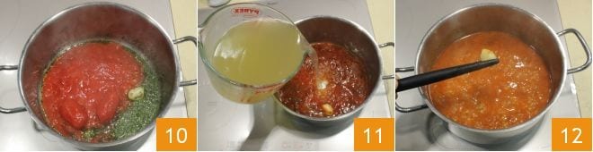 Dann die geschälten Tomaten hinzufügen 10 und das im Venusmuschelwasser aufgelöste Tomatenkonzentrat, ein paar Minuten kochen. Dann ein paar Schöpflöffel Gemüsebrühe hinzufügen 11, um es am besten zu machen, folgen Sie dem Rezept der Gemüsebrühe. Den Knoblauch mit einer Küchenzange entfernen 12