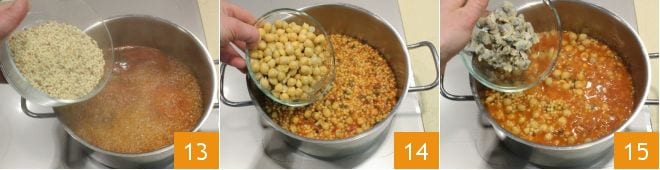 dann die Fregola 13 hinzufügen, die etwa 10-15 Minuten kochen soll. Weiter kochen, indem Sie nach und nach die Brühe hinzufügen. Zur Hälfte der Kochzeit auch die Kichererbsen 14 hinzufügen. Am Ende der Kochzeit auch die aus der Schale gelösten Venusmuscheln hinzufügen und das Feuer ausschalten 15.