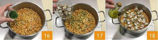 Mit Salz und Pfeffer abschmecken, mit einem weiteren Esslöffel gehackter Petersilie aromatisieren 16, dann auch die Venusmuscheln mit Schale hinzufügen, die Sie beiseite gelegt haben 17. Zum Schluss mit einem Schuss Olivenöl abschmecken 18 Ihre Fregola mit Venusmuscheln und Kichererbsen ist bereit, auf den Tisch gebracht zu werden, genießen Sie sie heiß begleitet von Carasau-Brot.