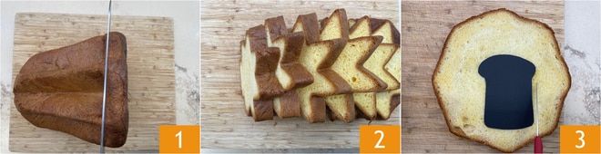 Um den French Toast aus Pandoro mit Nutella® zuzubereiten, schneidet ihr eine Pappschablone in Form einer Brioche-Brotscheibe. Dann schneidet ihr den Pandoro in etwa 2 cm dicke Scheiben 1 2. Schneidet mit Hilfe eines kleinen Messers die Formen aus, indem ihr die Schablone auf jede Pandoro-Scheibe legt 3. Aus den ersten 3 Scheiben erhaltet ihr zwei Formen und eine aus den darauffolgenden kleineren Scheiben.