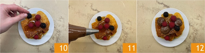 Garnieren mit Brombeeren und Himbeeren 10 und Tupfen von Nutella® mit Hilfe eines Spritzbeutels 11. Eure French Toasts aus Pandoro mit Nutella® sind bereit 12!