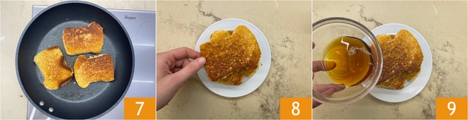 Es dauert nur wenige Minuten pro Seite, bis sie goldbraun sind 7. Serviert die Scheiben, indem ihr 3 Stück pro Portion stapelt 8 und mit Ahornsirup übergießt 9.