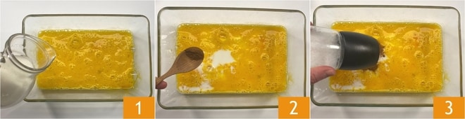 Um die French Toasts zuzubereiten, beginnen Sie zuerst damit, die Eier in einer flachen und breiten Auflaufform zu verquirlen, fügen Sie die Milch 1, den Zimt 2 und eine Prise Salz 3 hinzu.