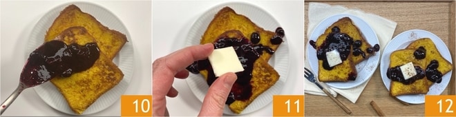 Einmal gekocht, garnieren Sie Ihre French Toasts direkt auf den Serviertellern: Wir haben Heidelbeermarmelade 10, ein Butterstückchen 11 und eine Prise Zimt verwendet. Ihr French Toast ist bereit, genossen zu werden 12!