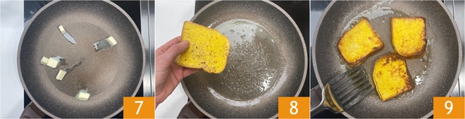 In der Zwischenzeit die Butter in einer Pfanne langsam schmelzen lassen 7. Wenn sie geschmolzen ist, legen Sie die Brioche-Scheiben hinein 8 und braten Sie sie 2-3 Minuten auf der einen Seite und 2-3 Minuten auf der anderen Seite, indem Sie sie mit einem Pfannenwender drehen 9. Wenn sie goldbraun sind, legen Sie sie auf einen Teller und fahren Sie fort, die restlichen Scheiben zu braten, wobei Sie darauf achten, jedes Mal ein weiteres Stück Butter in der Pfanne zu schmelzen.