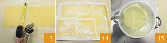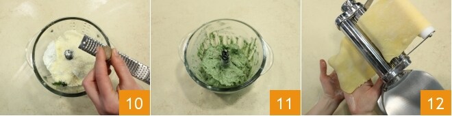 Fügen Sie auch die Mischung aus geriebenen Käsesorten hinzu, salzen und pfeffern Sie nach Geschmack und bestreuen Sie mit etwas geriebener Muskatnuss 10. Pürieren Sie alles 11 und geben Sie die erhaltene Creme in einen Spritzbeutel; Sie können sie bis zur Verwendung im Kühlschrank aufbewahren. Nach einer halben Stunde können Sie die Eierpasta mit einer Maschine zu einem dünnen Teig ausrollen, indem Sie den Teig von der dicksten bis zur dünnsten Einstellung durchlassen 12.