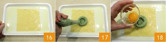Nach diesen Schritten lassen Sie die Quadrate auf einem geölten Tablett abtropfen 16. In die Mitte von 8 Quadraten formen Sie einen Kreis mit der Kräuter-Käse-Füllung und dann einen weiteren Kreis entlang des Rands des ersten 17; auf diese Weise haben Sie ein kleines Nest geschaffen, das Sie mit dem Eigelb füllen 18.