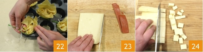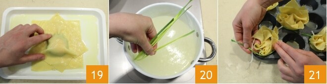Schließen Sie das Täschchen, indem Sie es mit einem weiteren Quadrat aus frischer Pasta bedecken, das diagonal wie eine Raute angeordnet wird 19. Bevor Sie die Täschchen schließen, schneiden Sie 8 Streifen Lauch in der Länge und blanchieren Sie sie für ein paar Minuten in dem Wasser, in dem Sie die Eierpasta gekocht haben 20: Dieser Schritt dient dazu, die Streifen weicher zu machen, die zum Versiegeln der Täschchen verwendet werden. Schließen Sie jedes Täschchen, indem Sie die Ränder der Pasta nehmen und legen Sie es in die vorher geölte Muffinform 21;