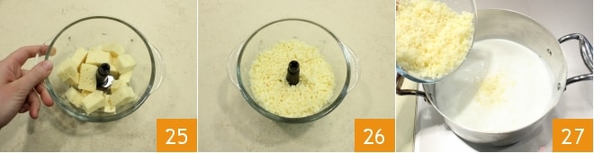 Geben Sie sie in die Schüssel eines Mixers 25 und zerkleinern Sie sie fein 26. In einem Topf erwärmen Sie die Milch und wenn sie kocht, schalten Sie die Hitze aus und geben Sie nach und nach den zerkleinerten Käse hinzu 27, und rühren Sie mit einem Schneebesen, um ihn zu schmelzen.