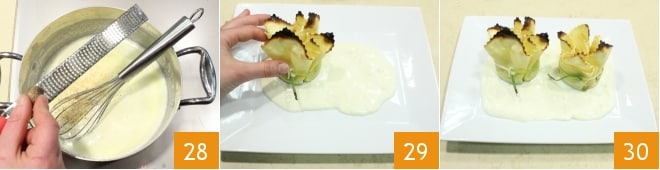 Schmecken Sie die Fonduta mit Salz und Pfeffer ab und würzen Sie sie mit geriebener Muskatnuss 28. Wenn die Fonduta einen Holzlöffel überzieht, schalten Sie die Hitze aus. Nun grillen Sie die Täschchen bei 250°C für 3 Minuten, dann gießen Sie die Fonduta spiegelartig auf die Servierteller 29 und legen Sie das Täschchen aus frischer Pasta mit geschmolzenem Eigelb 30 darauf, um es heiß zu servieren.