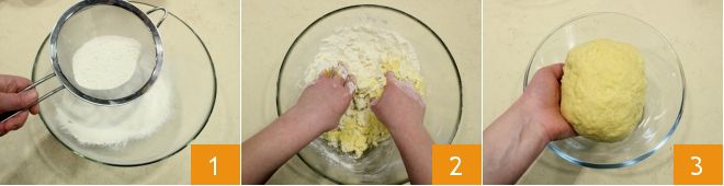 Um das Eierpastatäschchen mit geschmolzenem Eigelb vorzubereiten, beginnen Sie mit dem Teig für die Eierpasta: Sieben Sie das Mehl in eine Schüssel (oder auf ein Brett) 1 und geben Sie die Eier bei Raumtemperatur in die Mitte. Rühren Sie zunächst mit einer Gabel um, dann kneten Sie mit den Händen weiter 2. Wenn der Teig homogener wird 3, geben Sie ihn auf eine Arbeitsfläche,