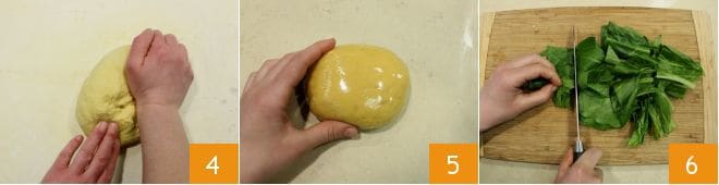 kneten Sie ihn 4 und formen Sie einen Teigballen, den Sie in Frischhaltefolie einwickeln können 5. Lagern Sie die Eierpasta an einem kühlen und trockenen Ort. In der Zwischenzeit widmen Sie sich der Füllung: Waschen Sie die Kräuter unter fließendem Wasser, dann brechen Sie die größeren 6
