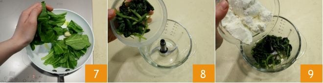 und lassen Sie sie in einer Pfanne mit einem Schuss Öl und einer ganzen Knoblauchzehe anbraten 7. Wenn sie gar sind, entfernen Sie den Knoblauch und geben Sie die Kräuter in einen Mixer, um sie zusammen mit dem Ricotta zu pürieren (8-9).