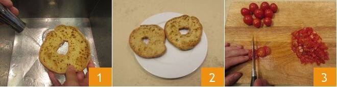 Um die Friselle mit Tomaten und Anchovis zuzubereiten, befeuchten Sie zuerst die Friselle mit kaltem Wasser 1 und legen Sie sie auf einen Teller 2. Waschen Sie die Kirschtomaten unter fließendem Wasser und schneiden Sie sie in kleine Stücke 3.