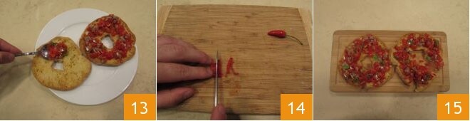 Platzieren Sie nun den Tomaten- und Anchovissalat mithilfe eines Löffels auf den Friselle 13. Entfernen Sie die inneren Kerne der Chilischote, schneiden Sie sie in Streifen 14 und legen Sie sie auf die Friselle mit Kirschtomaten und Anchovis 15.