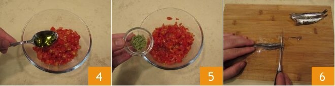 Geben Sie die gerade geschnittenen Kirschtomaten in eine Schüssel und würzen Sie sie mit Öl 4, Salz, Oregano 5 und schwarzem Pfeffer. Schneiden Sie die Eingelegte Sardellen in kleine Stücke 6,