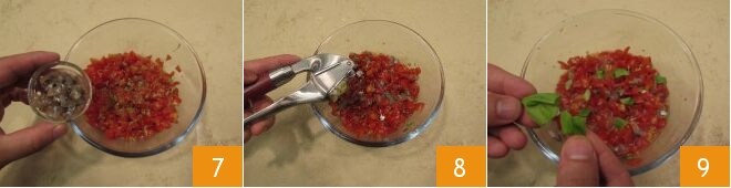 und fügen Sie sie dem Tomatensalat hinzu 7. Fügen Sie auch die Hälfte der Knoblauchzehe hinzu, nachdem Sie sie zerdrückt haben 8, und die Basilikumblätter, die Sie mit den Händen zerkleinert haben 9.