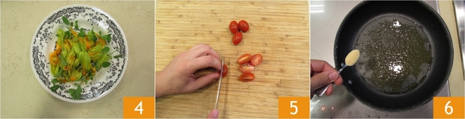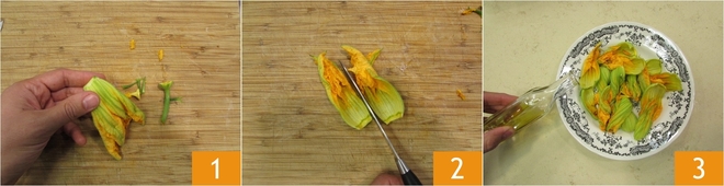Um die Friselle mit Gemüse und Taleggio-Sauce zuzubereiten, beginnen Sie mit den Zucchiniblüten. Reinigen Sie sie, indem Sie den Stiel, die äußeren und inneren Staubblätter entfernen 1. Schneiden Sie die Zucchiniblüten in der Mitte durch 2 und legen Sie sie auf einen Teller. Würzen Sie sie mit Salz und Öl 3.