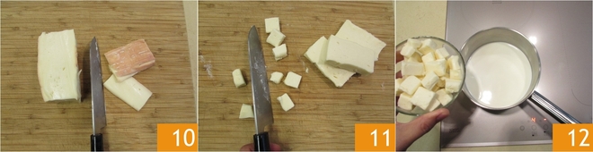 Kümmern Sie sich nun um die Taleggio DOP-Sauce. Schneiden Sie 100 g Taleggio DOP in Würfel 10 11. Erhitzen Sie die Sahne bei niedriger Flamme in einem kleinen Topf und fügen Sie den Käse hinzu 12.