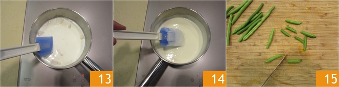 Rühren Sie 13, bis er vollständig geschmolzen ist, das dauert etwa 10 Minuten 14. In der Zwischenzeit reinigen Sie die grünen Bohnen und halbieren Sie sie 15.