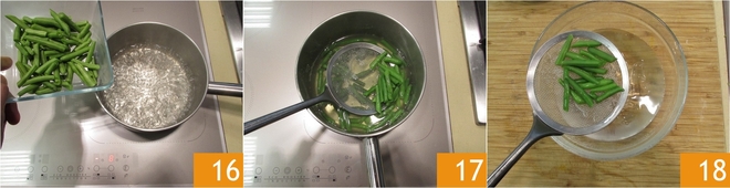 Tauchen Sie die grünen Bohnen in kochendes Wasser 16 und kochen Sie sie 7 Minuten lang. Verwenden Sie einen Schaumlöffel, um sie abzusieben 17 und in Eiswasser zu geben 18. Auf diese Weise behalten sie ihre leuchtende Farbe und ihre Knackigkeit.