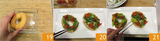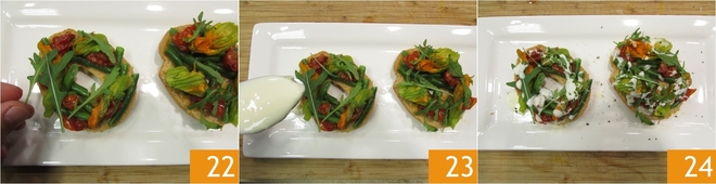 Weichen Sie die Friselle für ein paar Sekunden in Wasser ein 19 und legen Sie sie auf einen Teller. Legen Sie die Kirschtomaten, die grünen Bohnen 20 und die gewürzten Zucchiniblüten darüber 21.