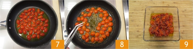 Erhitzen Sie das Feuer und legen Sie die Kirschtomaten mit der Schnittseite nach unten 7. Kochen Sie sie bei mittlerer bis hoher Hitze 10 Minuten lang, ohne sie zu bewegen 7. Zu diesem Zeitpunkt sind die Kirschtomaten karamellisiert, entfernen Sie sie mit einer Zange aus der Pfanne 8 und legen Sie sie in eine Schüssel 9.