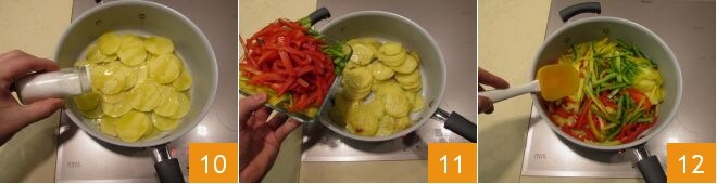 Geben Sie die in Scheiben geschnittenen Kartoffeln dazu, würzen Sie mit Salz 10 und Pfeffer, und lassen Sie sie bei mittlerer Hitze 3-4 Minuten kochen. Fügen Sie anschließend die Paprikastreifen hinzu 11 und lassen Sie sie weitere 7-8 Minuten kochen, dabei mit einem Spatel umrühren 12.