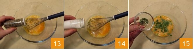 In einer separaten Schüssel schlagen Sie die Eier und würzen mit Salz und Pfeffer (13-14), Majoran und Thymian 15;