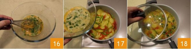 vermischen Sie alles mit einem Schneebesen, um die Zutaten gut zu verbinden 16. Wenn das Gemüse fertig ist, fügen Sie die geschlagenen Eier hinzu 17 und setzen Sie das Kochen für 10 Minuten bei niedriger Hitze fort, indem Sie einen Deckel darauf setzen 18.