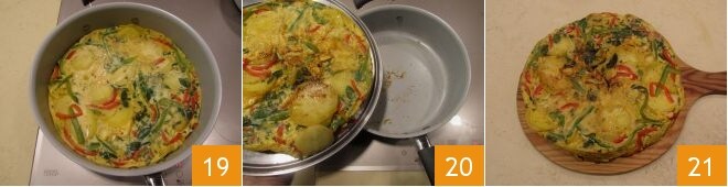 Nach Ablauf der erforderlichen Zeit 19 drehen Sie das Omelett mit Hilfe des Deckels um 20 und braten Sie es 2-3 Minuten auf der anderen Seite. Wenn es fertig ist, können Sie Ihr Kartoffel-Paprika-Omelett servieren und genießen 21.