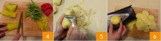 schneiden Sie sie dann in Streifen mit einer Dicke von 0,5 cm 4. Schälen Sie die Kartoffeln 5 und schneiden Sie mit einem Gemüsehobel 2-3 mm dicke Scheiben 6.