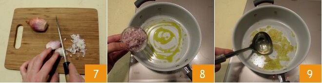 Schneiden Sie die Schalotte fein 7 und braten Sie sie in einem großen, antihaftbeschichteten Topf mit dem Öl an 8, dann fügen Sie die heiße Gemüsebrühe hinzu 9.