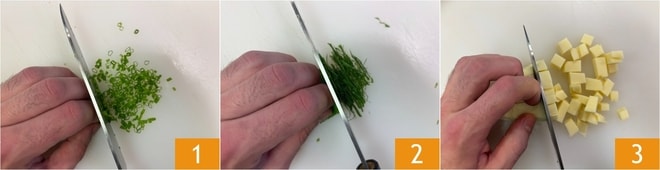 Um das Ricotta-Omelett vorzubereiten, hacken Sie zuerst den Schnittlauch 1 und die Minze 2 fein, dann schneiden Sie den Provolone in Würfel 3.