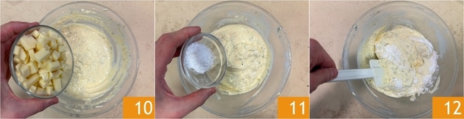Zuletzt fügen Sie die Provolonewürfel 10, das Instant-Backpulver 11 hinzu und mischen Sie erneut, um alles zu verbinden 12.