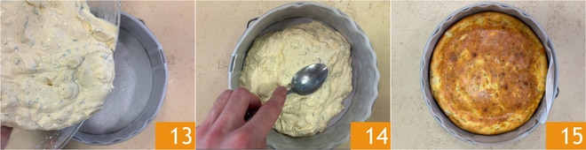 Gießen Sie die Mischung in eine mit Backpapier ausgelegte Form mit einem Durchmesser von 18-20 cm 13 und glätten Sie die Oberfläche 14. Backen Sie im vorgeheizten statischen Ofen bei 170° für etwa 35 Minuten. Sobald das Omelett gebacken und goldbraun ist, nehmen Sie es aus dem Ofen und lassen Sie es in der Form abkühlen 15, bevor Sie es herausnehmen und servieren!