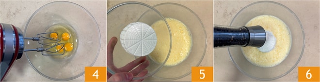 Schlagen Sie die Eier in eine große Schüssel und schlagen Sie sie mit einem elektrischen Mixer 4. Wenn Sie eine helle und schaumige Mischung erhalten haben, fügen Sie den Ricotta 5, Salz und Pfeffer 6 hinzu.
