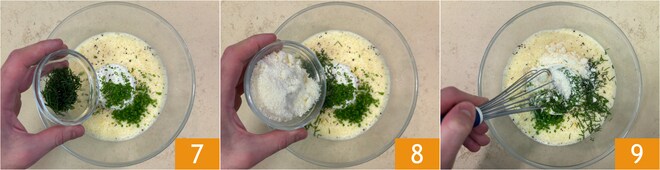 Fügen Sie auch die gehackten aromatischen Kräuter 7 und den geriebenen Parmesankäse 8 hinzu, dann mischen Sie gut mit einem Schneebesen 9.
