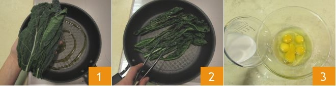 Um die Frittatine mit Schwarzkohl zuzubereiten, entfernen Sie zuerst die Stiele des Schwarzkohls und spülen Sie die Blätter unter fließendem Wasser ab, wobei Sie sie ganz lassen. Erhitzen Sie einen Schuss Öl in einer Pfanne, fügen Sie die Schwarzkohlblätter hinzu 1 und braten Sie sie etwa 5 Minuten lang bei starker Hitze an, bis sie weich sind 2. Legen Sie den Schwarzkohl beiseite und kümmern Sie sich um die Eiermischung: Geben Sie die Eier in eine Schüssel und fügen Sie die Milch hinzu 3,