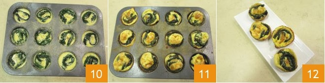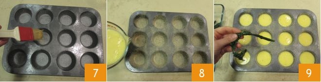 Fetten Sie ein Muffinblech ein 7 und bestreuen Sie es mit Semmelbröseln, dann verteilen Sie die Eiermischung gleichmäßig in der Form 8 und legen Sie ein Blatt Schwarzkohl in jedes Fach 9.
