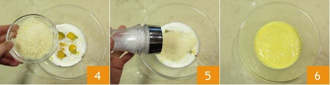 den geriebenen Parmesan 4, Salz 5 und Pfeffer, dann vermengen Sie alles mit einem Schneebesen oder einer Gabel 6. Übertragen Sie die Mischung in einen Krug, um die Förmchen leichter zu füllen.