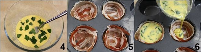 zum Schluss fügen Sie das mit den Händen zerpflückte Basilikum 4 hinzu, um die Mischung zu aromatisieren. Nehmen Sie ein Muffin-Blech und kleiden Sie jede Form mit zwei Speckscheiben aus, indem Sie sie kreuzen, sodass die gesamte Oberfläche bedeckt ist 5. Es ist nicht notwendig, die Förmchen zu fetten, da der Speck selbst, dank seines Fettgehalts, verhindert, dass die Mischung an der Form haftet und eine köstliche knusprige Kruste bildet, die den Korb formen wird. Füllen Sie die Eiermischung in jede Form 6 und füllen Sie sie bis knapp unter den Rand (mit den angegebenen Mengen können 12 Förmchen gefüllt werden). Backen Sie für 12-15 Minuten, bis die Oberfläche der Omeletts schön goldbraun ist. Nach dem Backen die Omeletts herausnehmen und heiß servieren.
