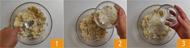 Um die Blumenkohlpfannkuchen zuzubereiten, geben Sie zuerst die gedämpften Röschen in eine Schüssel und zerdrücken sie mit einer Gabel 1. Fügen Sie dann den Parmesan 2 und das Salz 3 hinzu.