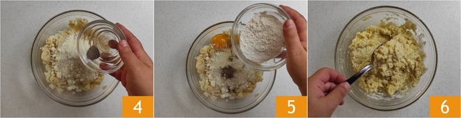 Geben Sie den Pfeffer 4, die Eier, das Mehl 5 hinzu und kneten Sie, bis Sie eine homogene Masse erhalten 6.