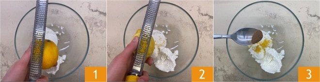 Um die süßen Ricotta-Krapfen zuzubereiten, geben Sie zuerst den Ricotta in eine Schüssel, dann fügen Sie die geriebene Orangenschale 1, die Zitronenschale 2 und den Zimt 3 hinzu.