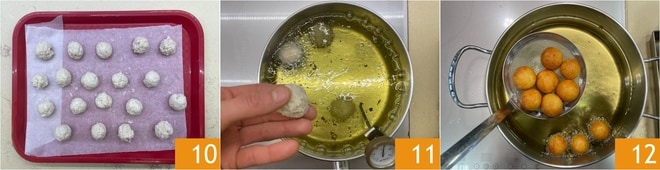 Legen Sie die Kugeln nach und nach auf ein mit Backpapier belegtes Tablett 10. Erhitzen Sie das Sonnenblumenöl auf 160°C und frittieren Sie wenige Krapfen gleichzeitig, um die Öltemperatur nicht zu stark zu senken 11. Frittieren Sie für 3-4 Minuten bis zur goldbraunen Farbe, dann heben Sie sie mit einem Schaumlöffel heraus 12.