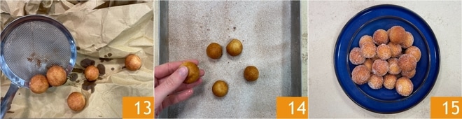 Geben Sie die Krapfen auf saugfähiges Papier, um überschüssiges Öl zu entfernen 13, dann wälzen Sie sie noch heiß in einer Mischung aus Zucker und Zimt 14. Ihre süßen Ricotta-Krapfen sind bereit, genossen zu werden 15!