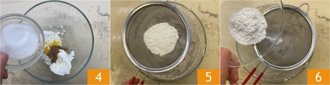 Fügen Sie den Zucker hinzu 4, dann sieben Sie das Mehl 5 und die Kartoffelstärke 6 hinein.