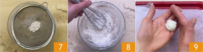 Fügen Sie auch das gesiebte Backpulver hinzu 7 und mischen Sie, bis ein homogener Teig entsteht 8. Nehmen Sie etwa 12 g Teig auf einmal und formen Sie Kugeln 9.